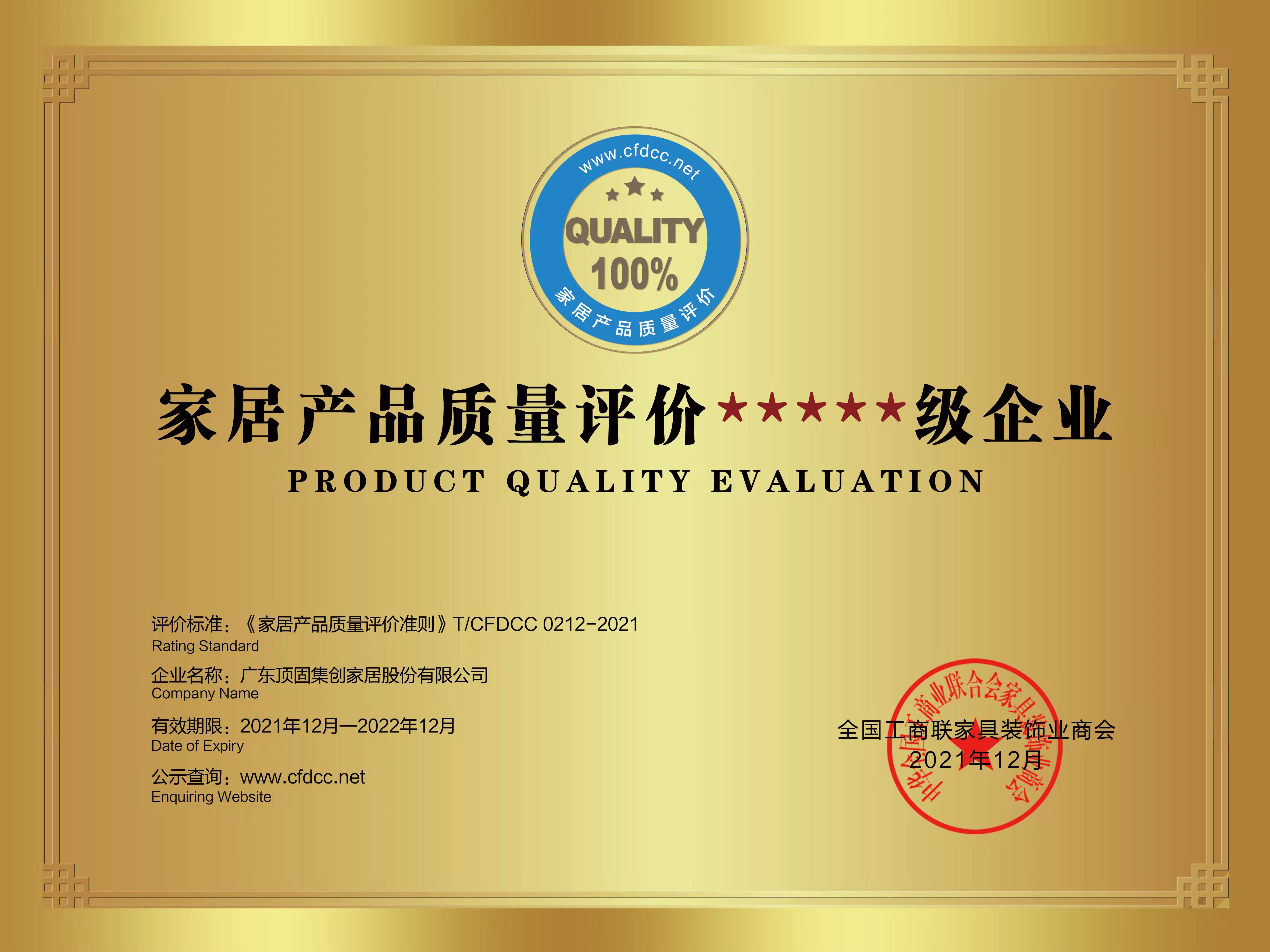 頂固憑借著精益求精的產品品質,被全國工商聯家具裝飾業商會評為“家居產品質量評價五星級企業”。