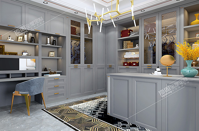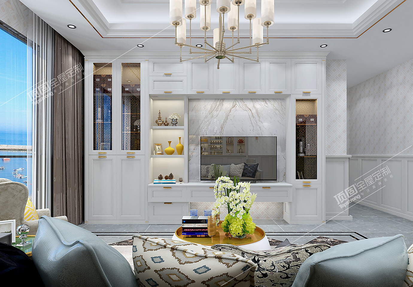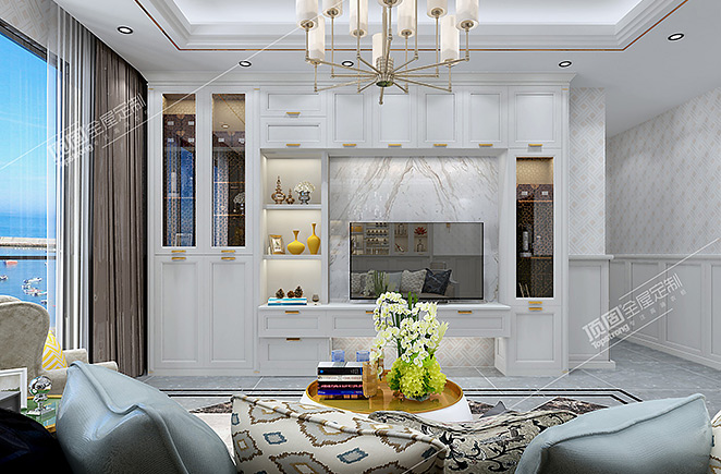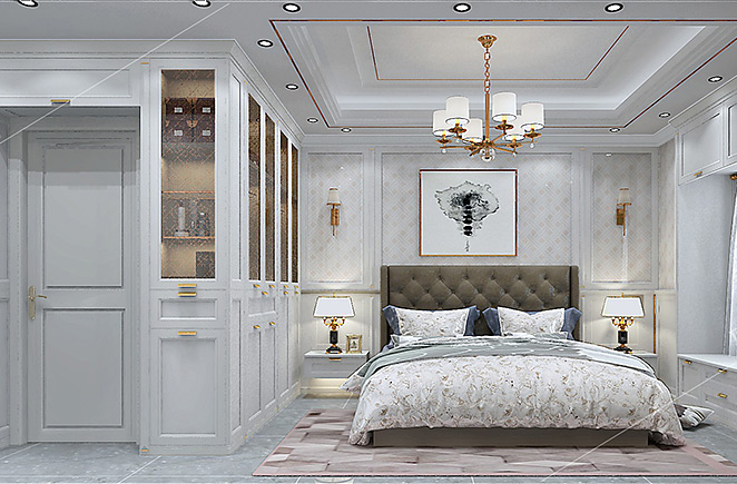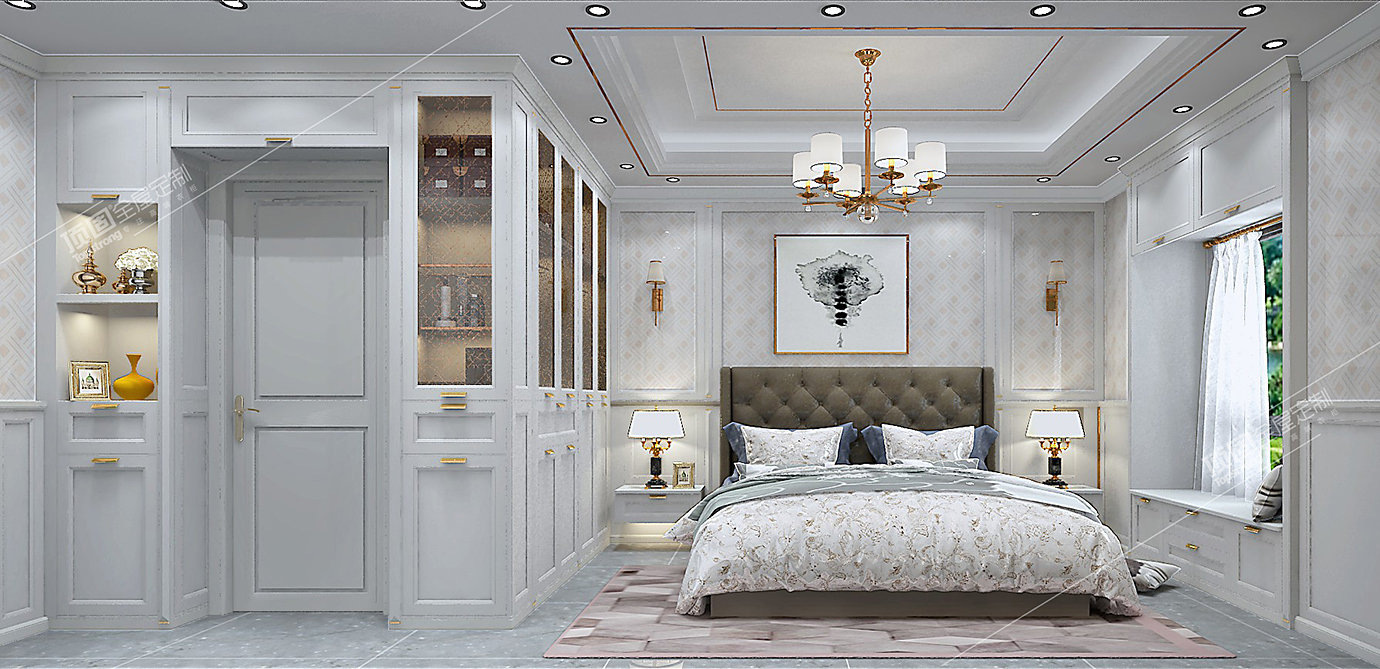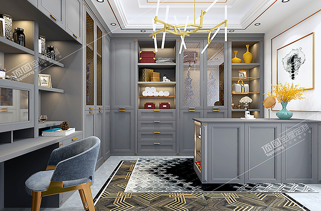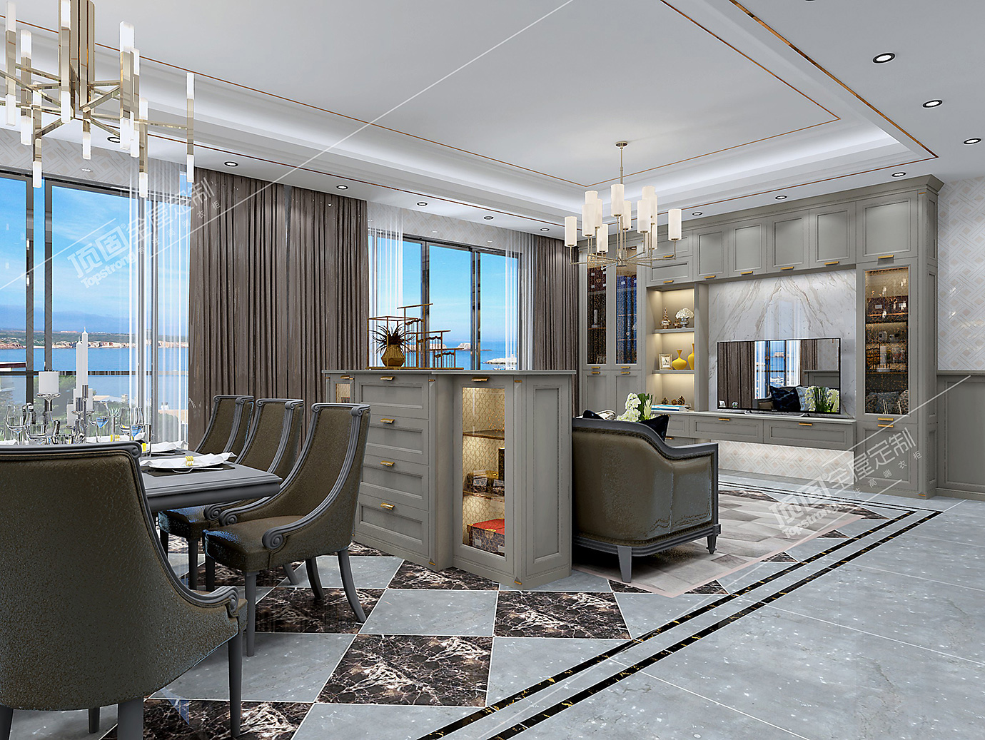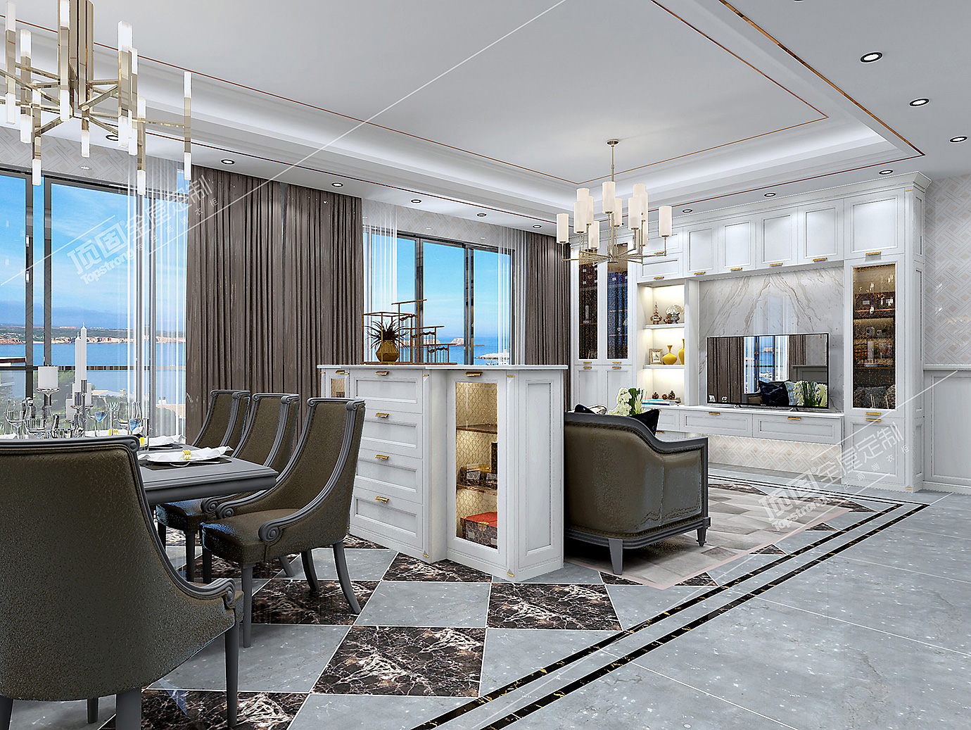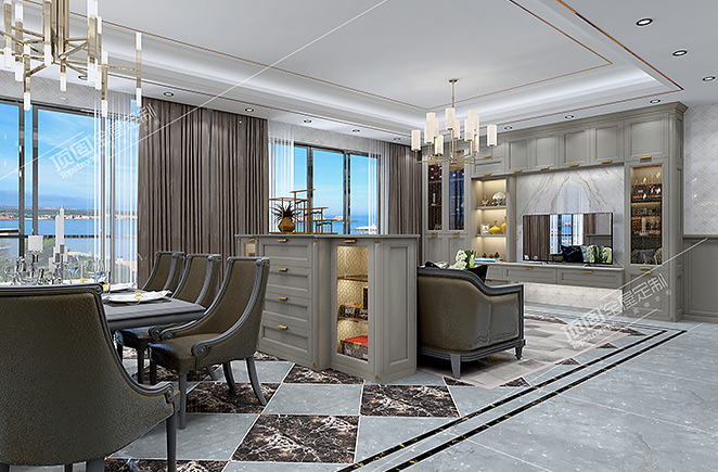 各種到頂柜體設計,既有掩門設計的儲物柜,又有開放式的儲物格,想要怎么收納就怎么收納。墻邊掛上描金邊框的掛畫,餐桌椅線條簡潔嚴謹,外形厚重端莊,流露出尊貴的皇室風情和文藝氣息。