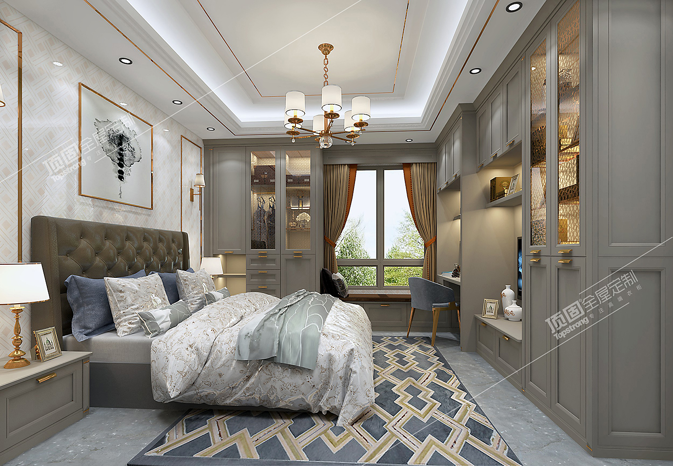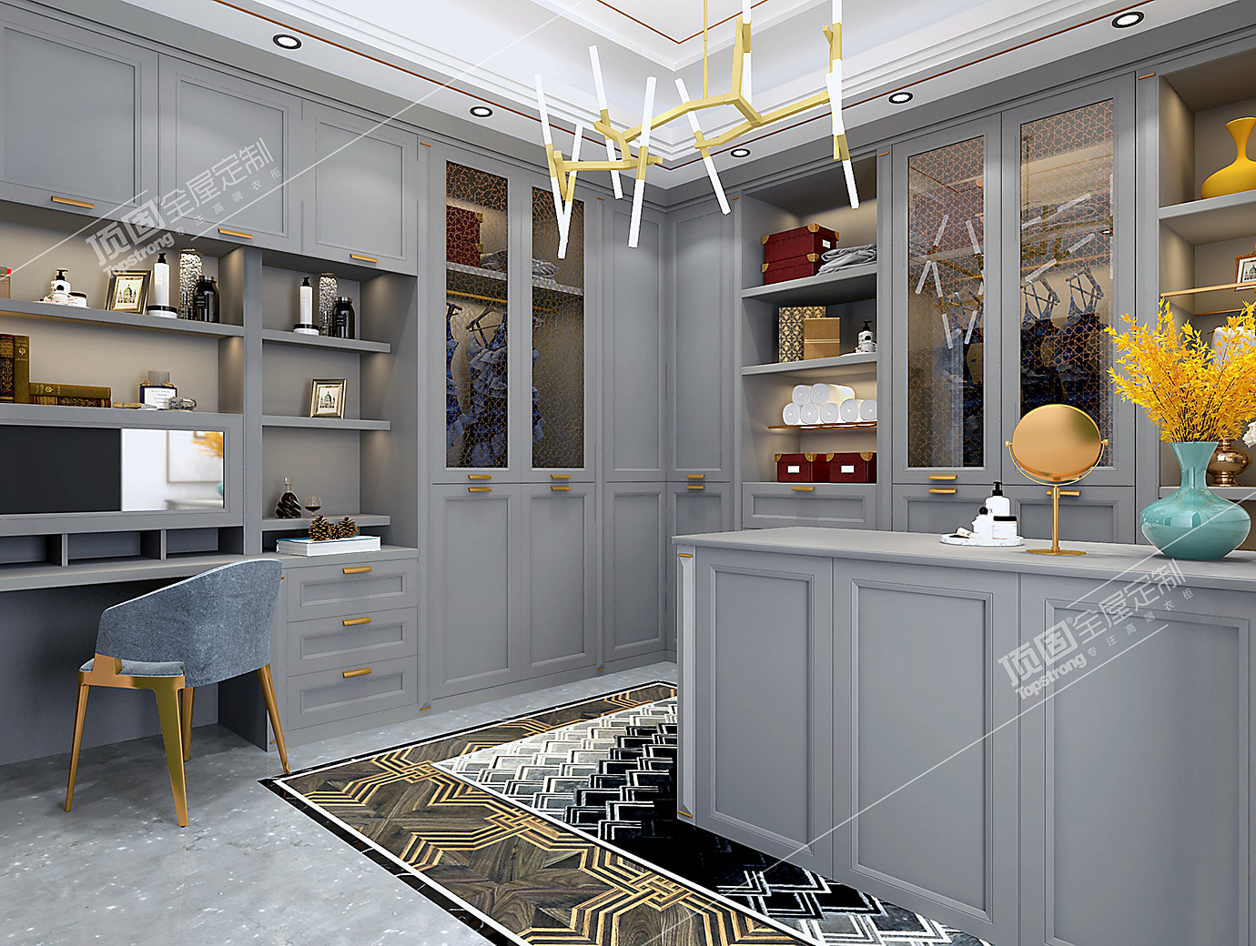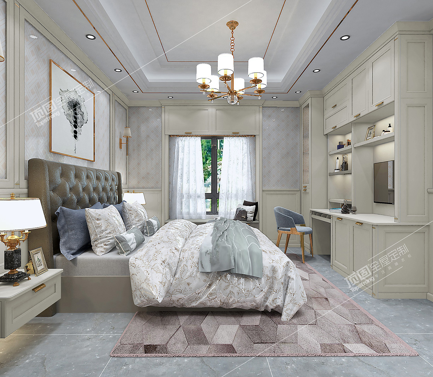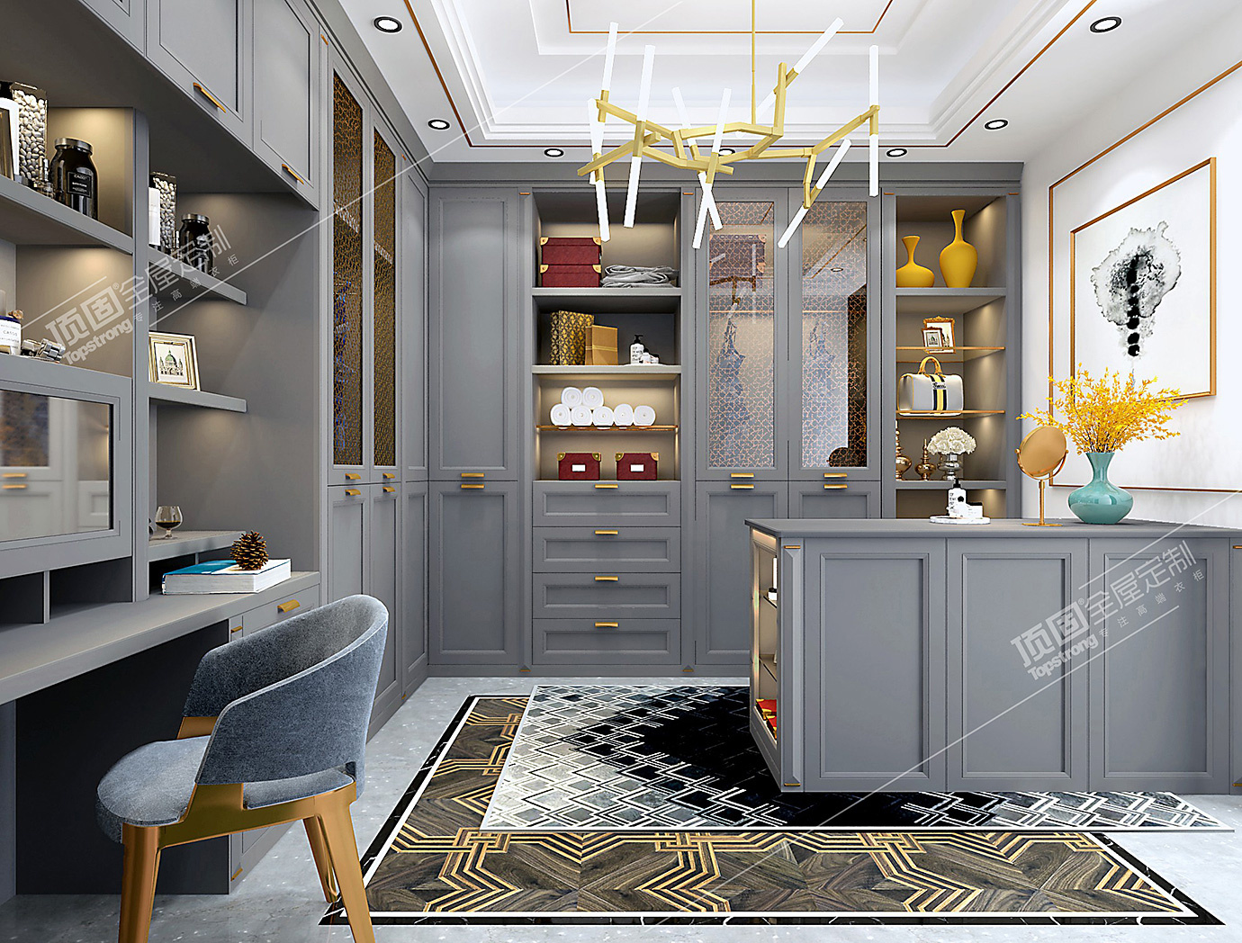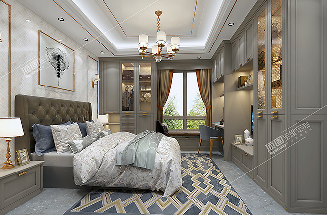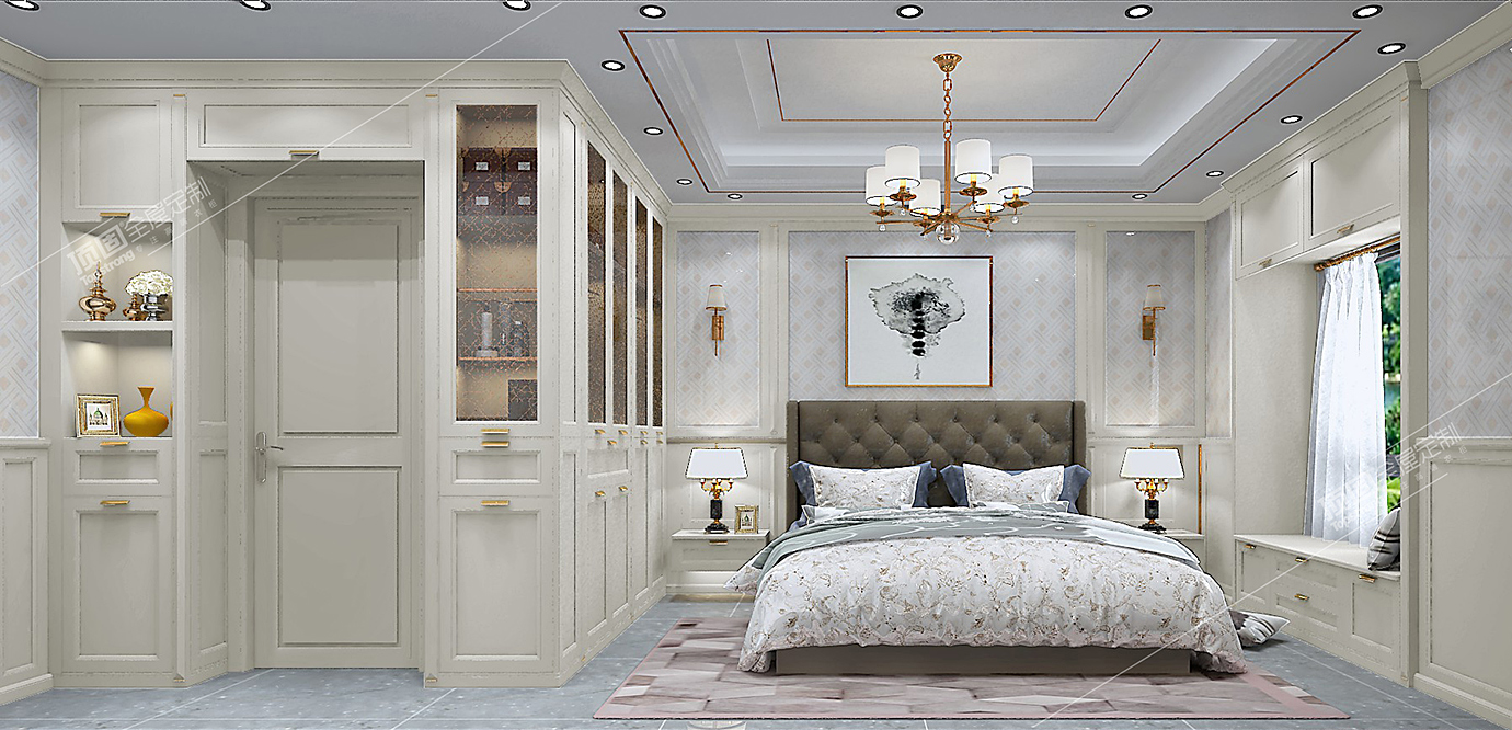 各種到頂柜體設計,既有掩門設計的儲物柜,又有開放式的儲物格,想要怎么收納就怎么收納。墻邊掛上描金邊框的掛畫,餐桌椅線條簡潔嚴謹,外形厚重端莊,流露出尊貴的皇室風情和文藝氣息。