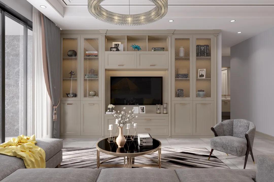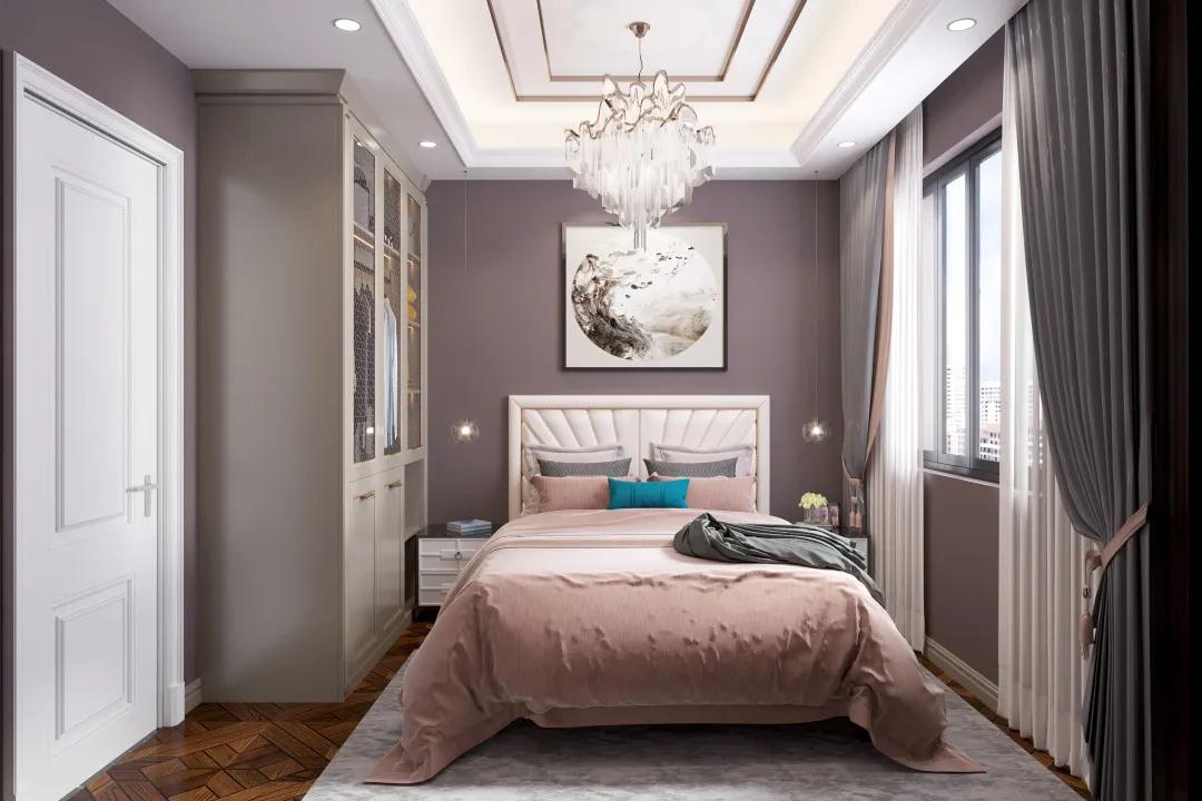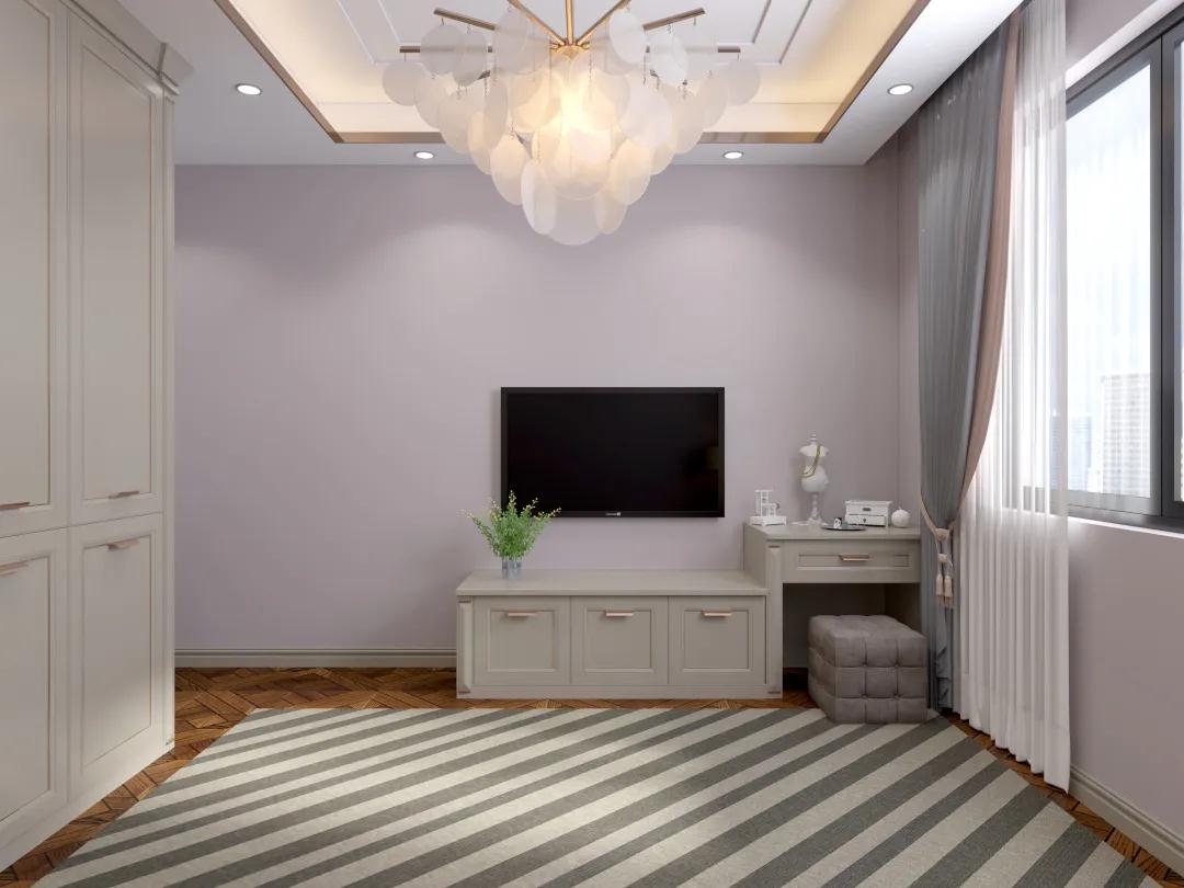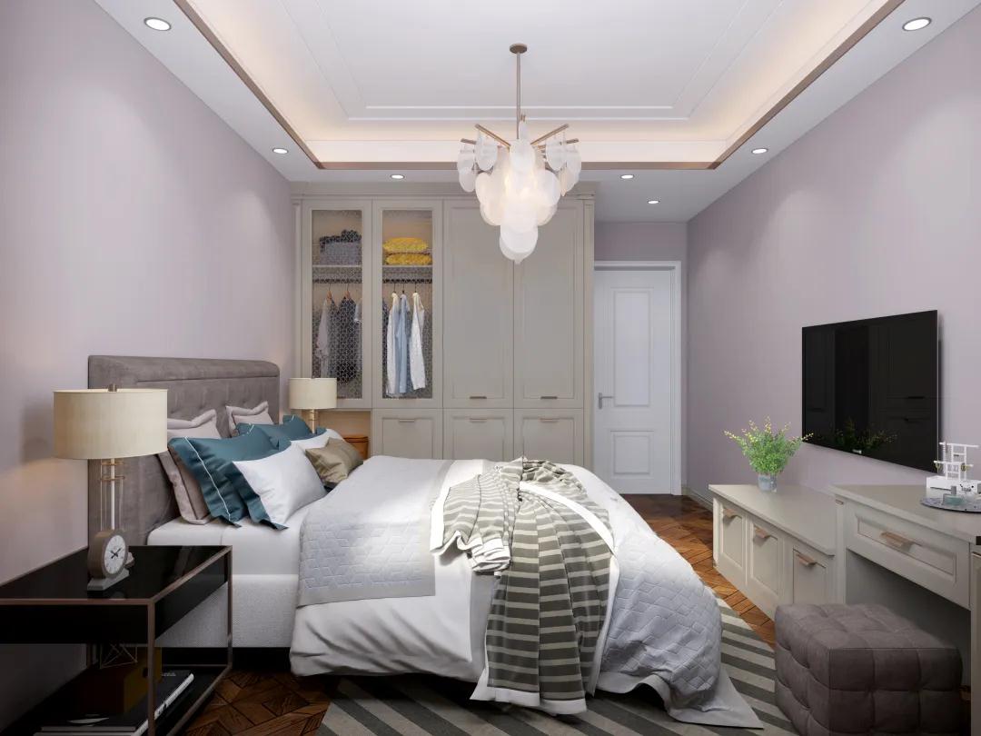 主臥猶如一個歐洲小宮殿,炫酷銀的柜面在燈光的烘托下熠熠發(fā)光,帶有復(fù)古氣息的床與電視柜,和衣柜相得益彰;衣柜置頂設(shè)計,分上下兩區(qū),并且留出透明玻璃裝飾的可視區(qū)域,方便日常穿搭需求。