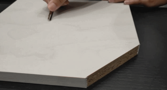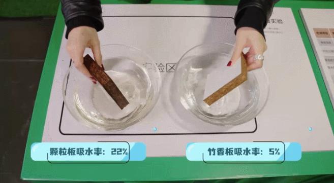 在竹香板和顆粒板的側面分別滴上一滴水,然后湊近樣品閉眼感受它們散發的氣味。此時你會發現,顆粒板木味混雜,略顯刺鼻,而竹香板則自帶一陣淡淡的竹子清香,十分清新。