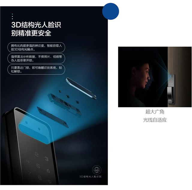 頂固T8F-3D人臉識(shí)別智能鎖可謂是火眼金睛,采用與蘋(píng)果、支付寶同量級(jí)的3D結(jié)構(gòu)光技術(shù),只要你往門前一站,門鎖便能自動(dòng)感應(yīng)并開(kāi)啟人臉識(shí)別,解鎖只在一瞬間。而且這款門鎖配備超大廣角,非常有容人的“肚量”,無(wú)論高矮胖瘦,都能輕松識(shí)別;在昏暗環(huán)境還能進(jìn)行自動(dòng)光線調(diào)節(jié),不用擔(dān)心晚上門鎖無(wú)法開(kāi)啟。