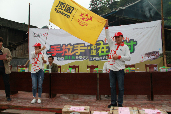 22日清晨,春風陣陣,手拉手旗幟隨風飄揚,成為山區一道亮麗的風景線。頂固第七所希望小學奠基儀式上,頂固手拉手愛心計劃發起人、頂固義工團團長林新達先生把愛心旗幟正式傳遞到會同頂固衣柜總經理梁新莉女士手中。傳遞一面旗幟,傳承一種責任,梁總激動的表示:“我接過的不僅是一面旗幟,更是一種責任,從此我肩負頂固公益事業使命,傳承頂固人的公益精神,讓頂固愛心繼續傳遞下去。請大家為我見證!”