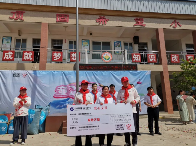 2023年6月1日上午,以“童心童行”為主題的頂固河南希望小學大型公益回訪活動儀式在河南頂固勸門希望小學隆重舉行。頂固董事長林新達、頂固董事長夫人林潔、新密市市委常委兼茍堂鎮黨委書記楊翔、新密市教育局局長劉振敏、北京南山學校副校長張冬至、茍堂鎮黨委委員武裝部劉東升、中華少年兒童慈善救助基金會項目二部執行主任趙瑋、河南頂固建材有限公司總經理孟福卿、茍堂鎮勸門村支部書記主任劉玉虎、河南頂固希望小學校長劉鳳琴以及頂固義工團、北京南山師生一行人、河南頂固勸門希望小學的全體師生共同參與了本次活動,大家在這里與最純真的笑容相遇,履行關于美好的約定,為孩子們架起一座夢想的橋梁,讓愛心漸漸蔓延。