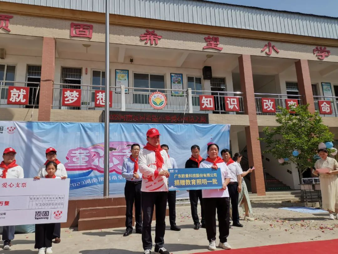 會上,出席的領導及嘉賓為河南勸門希望小學校舍災后修繕的完成進行隆重的剪彩儀式。2021年7•20特大暴雨,頂固共捐贈了60萬元,其中30萬元用于勸門村的慰問,30萬元頂固專項基金用于希望小學的修繕。同時,作為友好愛心企業的廣東歐曼科技有限公司為學校捐贈了一批教育環保照明共6套。