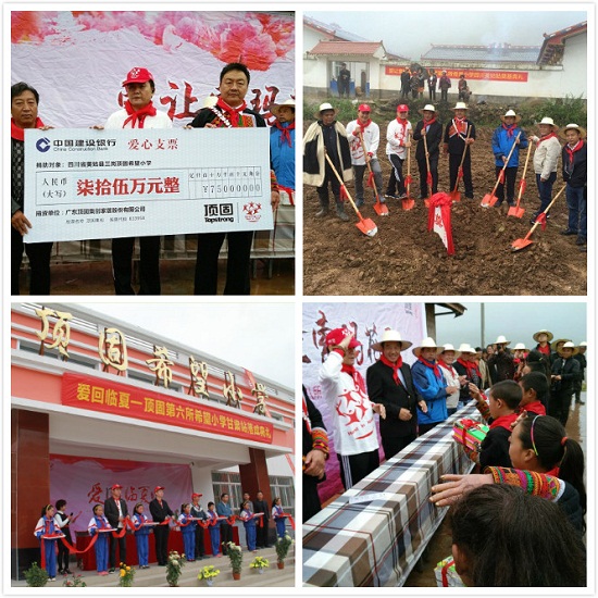 早在2009年,在頂固公司董事長林新達(dá)的倡議下,在全國頂固合作伙伴、頂固經(jīng)銷商和各方愛心人士的盛情參與下,啟動(dòng)頂固手拉手愛心助學(xué)計(jì)劃,動(dòng)員各方資源和力量,捐資助學(xué)。至今,已在云南、貴州、青海、河南、江西、甘肅、四川、湖南、陜西捐建了九所希望小學(xué),十年無償投入數(shù)百萬,通過產(chǎn)業(yè)扶貧、教育扶貧和就業(yè)扶貧等一攬子綜合措施,確保這九所希望小學(xué)所覆蓋村鎮(zhèn)適齡兒童全部有學(xué)上。目前,已幫助數(shù)千貧困家庭解決子女小學(xué)階段教育問題。除此之外,十年來,頂固義工團(tuán)一對一幫扶共計(jì)數(shù)百名學(xué)生,實(shí)地走訪上百戶貧困學(xué)生家庭。